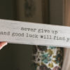Ready-to-ship, rustic wood wall art that reads “never give up and good luck will find you”. The letters are painted black, on a painted-white wood background. The background has been distressed to give this sign a rustic, vintage look.